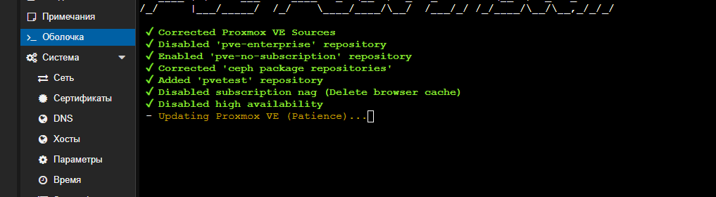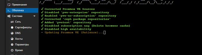 Этот скрипт предоставляет опции для управления репозиториями Proxmox VE, включая отключение корпоративного репозитория, добавление или исправление источников PVE, включение репозитория без подписки, добавление тестового репозитория, отключение проверки подписки, обновление Proxmox VE и перезагрузку системы.